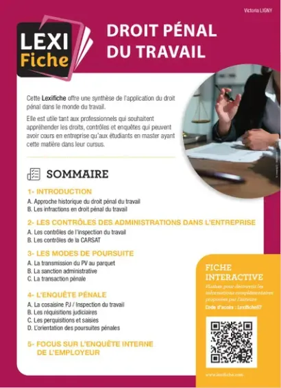 Cette Lexifiche vous propose une synthèse du droit pénal du travail : infractions réprimées en entreprise (harcèlement moral et sexuel, travail illégal, discriminations…), contrôles administratifs pouvant être diligentés par l’Inspection du travail et la CARSAT en entreprise, cas dans lesquels une enquête pénale peut être lancée, palettes de sanctions pouvant être appliquées…