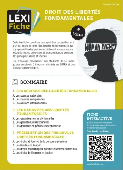 Les droits humains et les libertés publiques sont au cœur de notre droit. Ils puisent leur source aussi bien dans le droit interne (Déclaration des droits de l’homme et du citoyen notamment), qu’en droit européen (Convention européenne de sauvegarde des droits de l’homme et des libertés fondamentales) et en droit international (entre autres la Déclaration universelle des droits de l’homme). Cette Lexifiche offre une synthèse claire sur les libertés fondamentales. Elle permet au lecteur d’y voir plus clair entre toutes ces sources et de mieux comprendre les droits fondamentaux dont dispose tout citoyen : respect de la vie privée, égalité de droits, liberté d’expression, liberté de réunion…