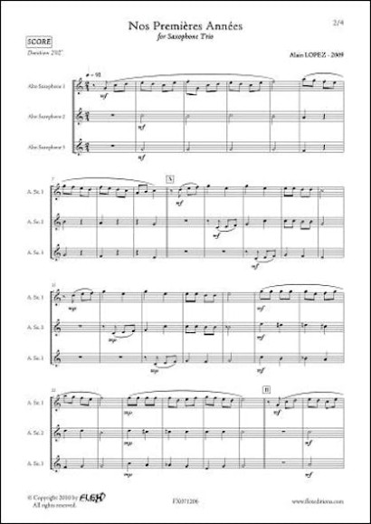 Ce trio tout simple permettra aux jeunes élèves de jouer rapidement ensemble (un an de pratique pour la 2ème et 3ème voix et un an et demi pour la 1ère voix). A apprécier lors d’une audition.- Alain LOPEZ. Formation : Trio de Saxophones. Instrumentation : 3 Saxophones Alto. Niveau de Difficulté : Débutant. Durée : 2'20''. Style Musical : Classique, Pédagogique. Catégorie : Composition Originale. Compositeur : Lopez Alain .
