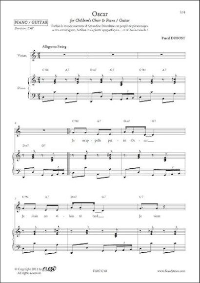 Pour enfants entre 8 et 12 ans. Formation : Chorale d'Enfants, Piano ou Guitare. Instrumentation : Chorale d'Enfants (de 8 à 12 ans), Piano ou Guitare. Niveau de Difficulté : Facile. Durée : 1'50. Style Musical : Classique, Pédagogique. Catégorie : Composition Originale. Compositeur : Dubost Pascal.